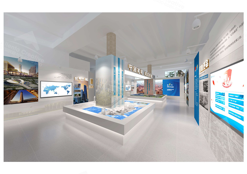 “火雷精神”抗疫醫院沙盤展項,包括火神山醫院、雷神山醫院、負壓病房模型等,以及“中國建筑 建證戰疫”專題片,綜合利用多媒體、數字化展陳技術,發揮“屏幕、模型、沙盤”協同互動效應,踐行人民至上、生命至上理念,在國內奮力建成以火神山、雷神山醫院為代表的119 所應急醫院。 “拓展幸福空間”中建幸福城沙盤展項,包括由多維信息綜合呈現的數字化城市模型沙盤,以及中國建筑品牌形象片。精選中國建筑全產業鏈、全業態、全球代表性建筑作品,以影像屏幕為載體,搭建起一座由實體建筑模型組合而成的“未來之城”“智慧之城”“幸福之城”。緊密結合投資建設領域特色,突出“可看性、體驗性、科技性”,踐行企業使命、服務國家戰略、勇擔改革重任、引領行業發展、打造“具有全球競爭力的世界一流企業”的品牌之路。